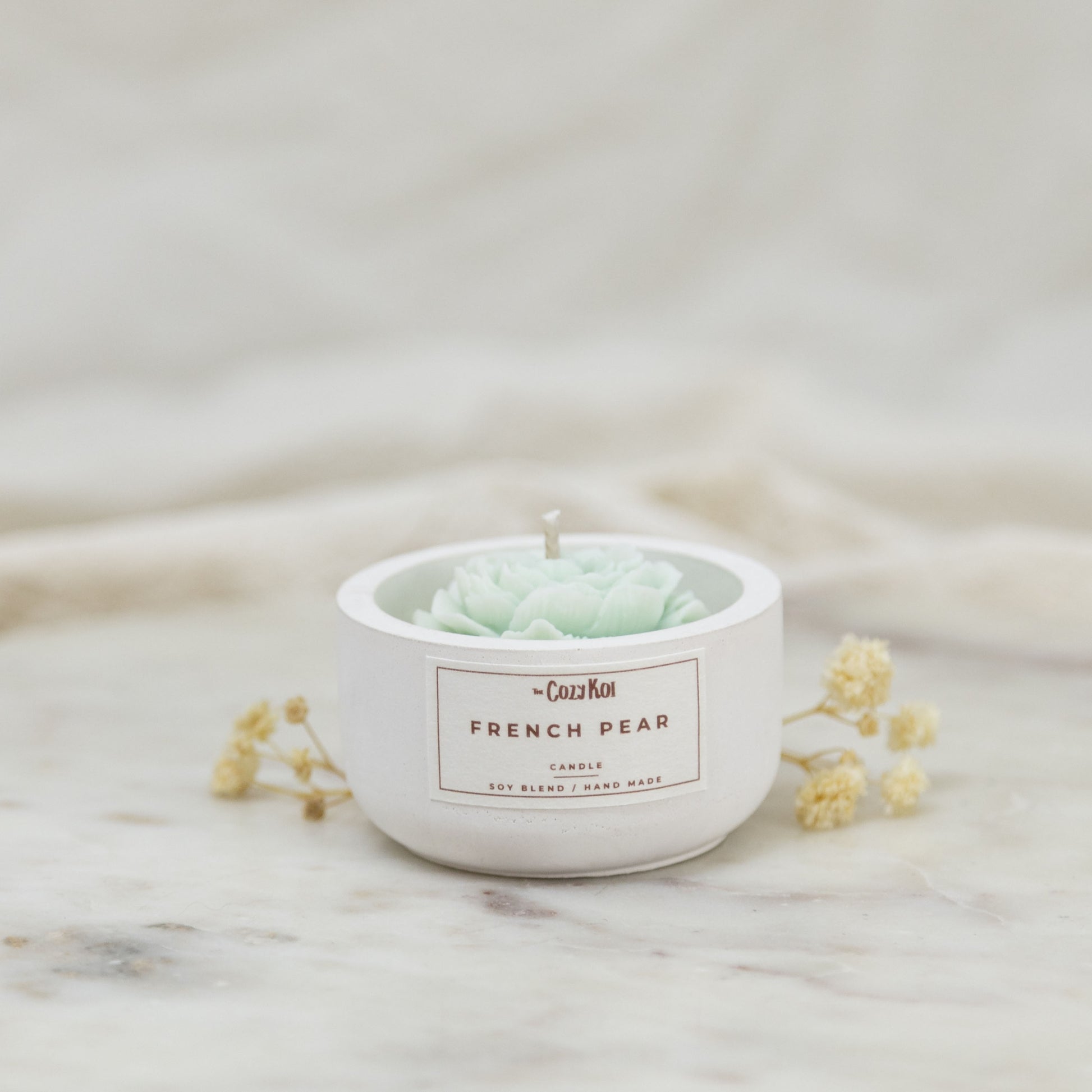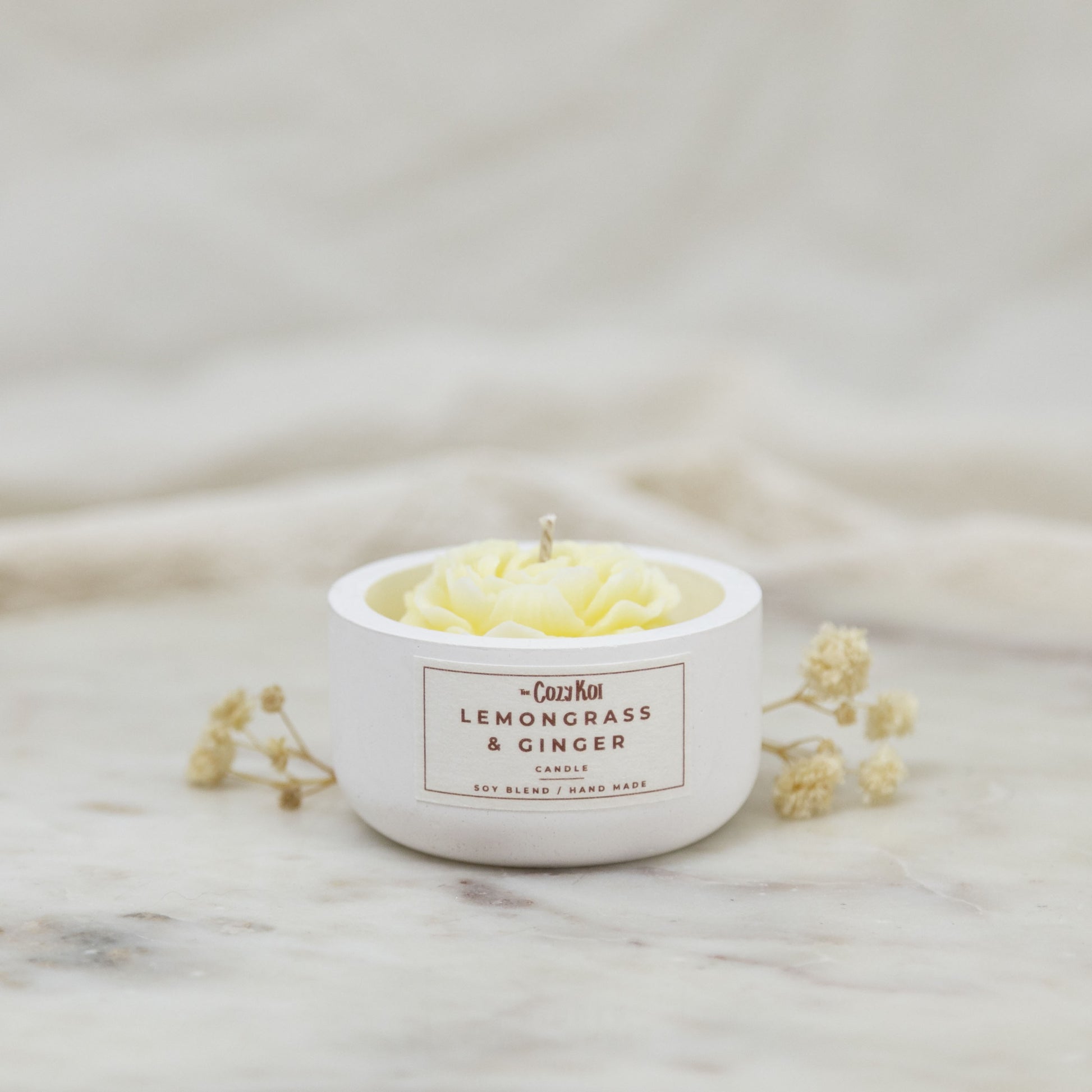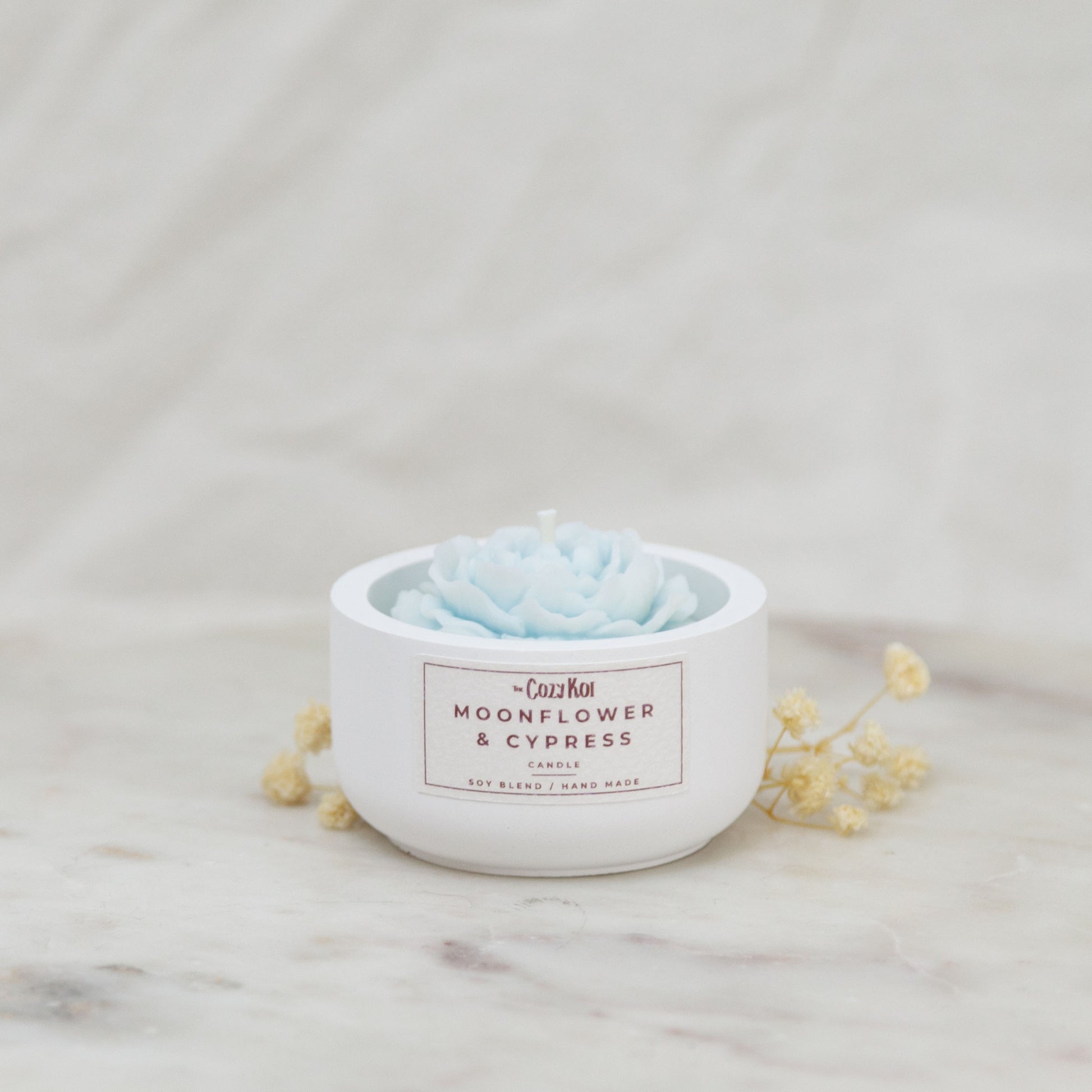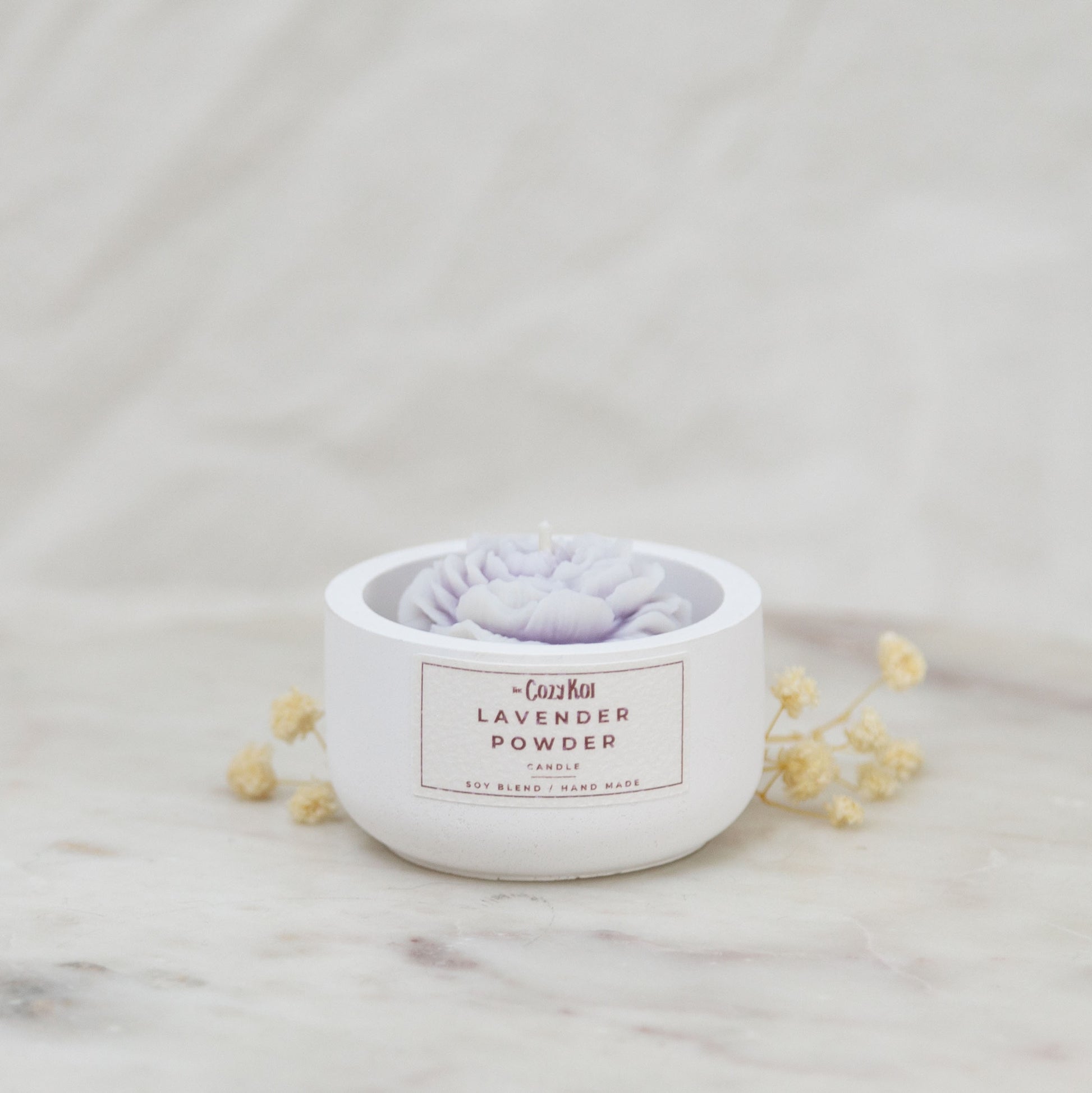 Bring elegance and tranquility into your space with our Flower Candle in an Ivory Concrete Pottle. Hand-poured with 40g of a luxurious soy and beeswax blend, this flower-shaped candle comes in seven enchanting scents, each represented by a different color.